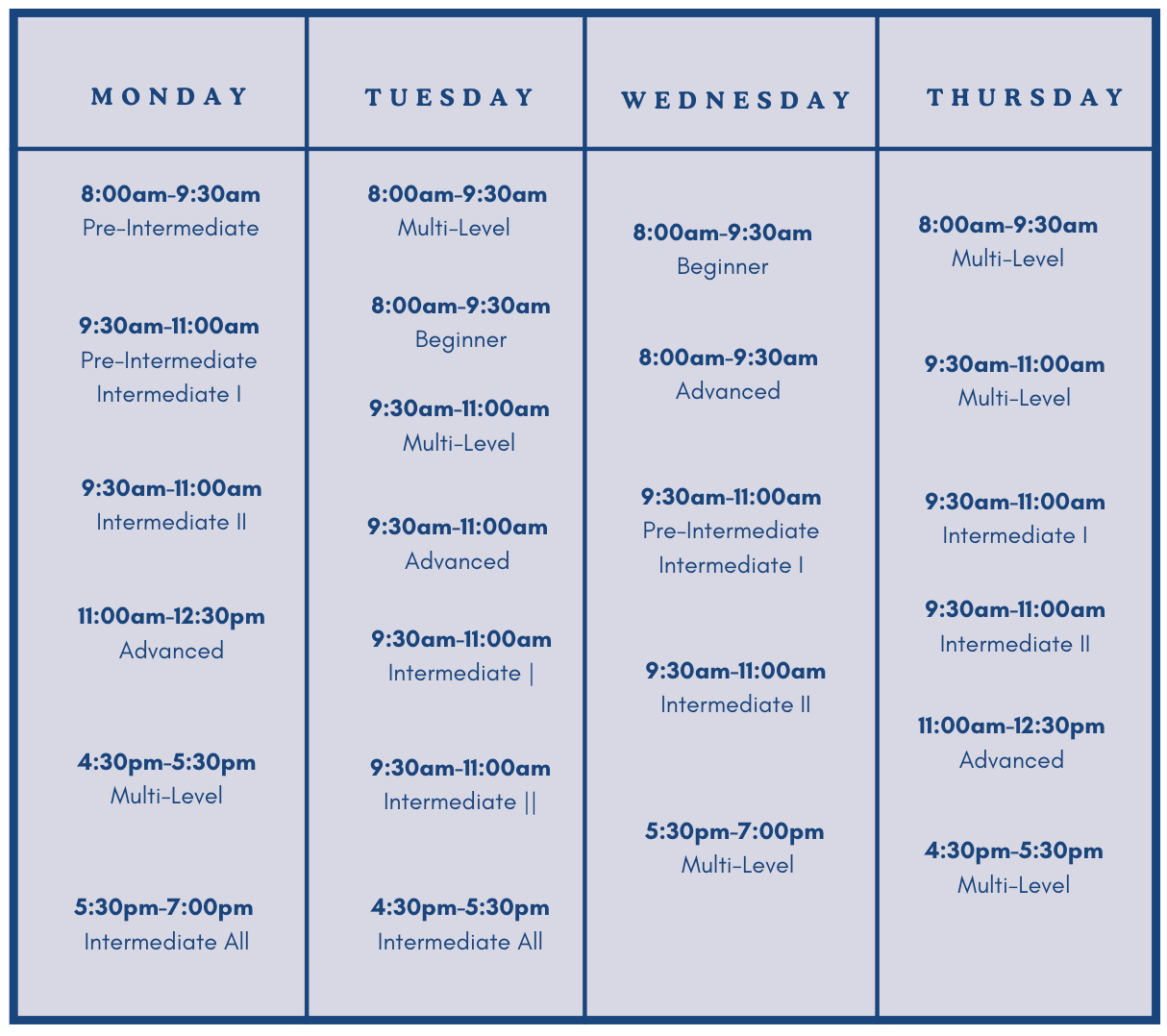 In the meantime, you’re welcome to schedule a 30-minute private lesson evaluation or register for a Multi-Level or Pre-Intermediate Clinic.