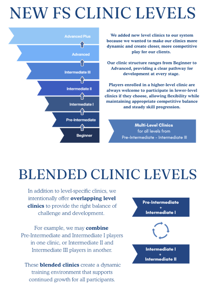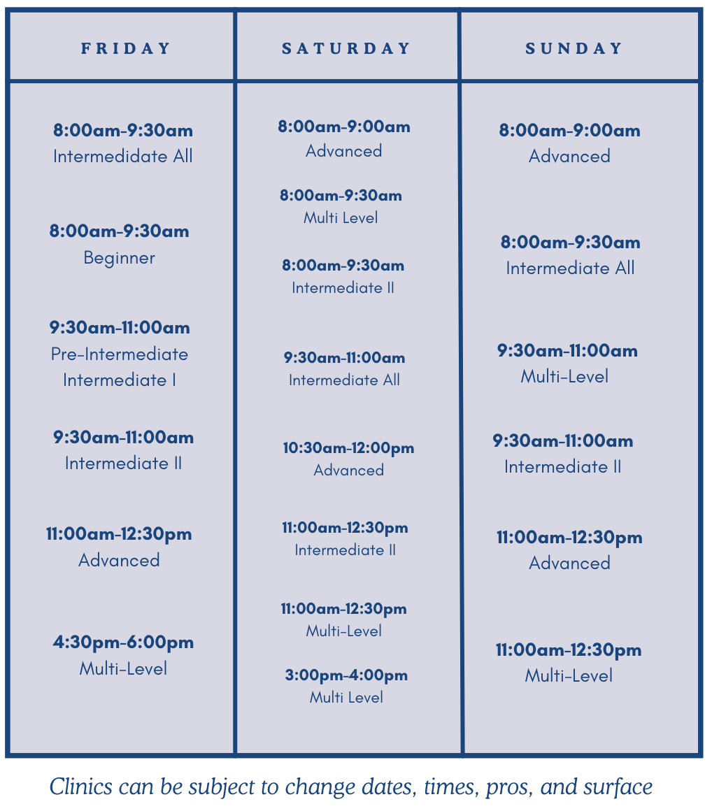 Multi Level Clinics - Ranging from Pre-Intermediate - Advanced, adult clinics provide a mix of energy, instruction, repetition, fed-ball drills, and live-ball drills. The goal of multi level clinics is to emphasize competition strategy, pace, ending points, fitness, pressuring opponents and match play.